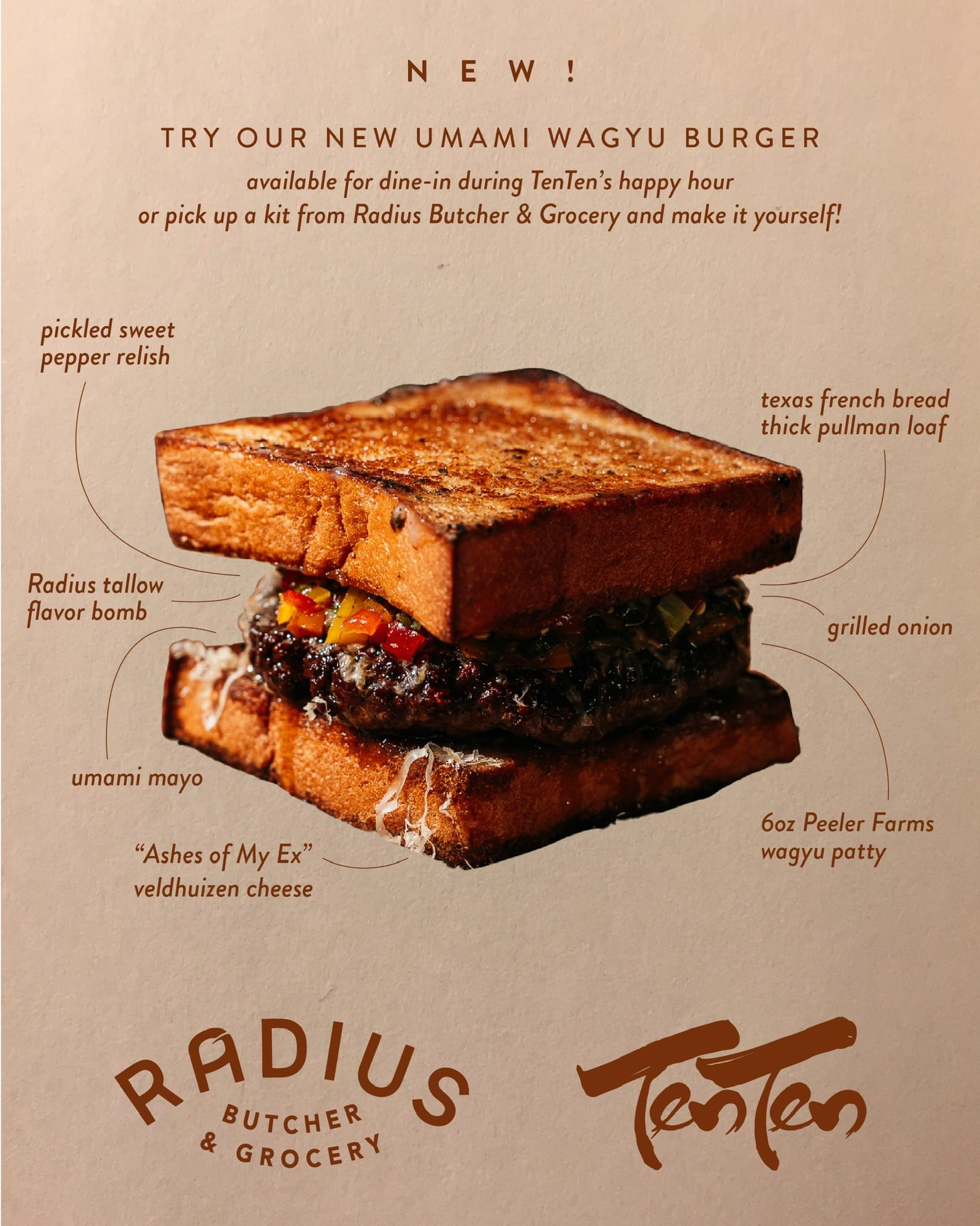 - TenTen x Radius Umami Wagyu Burger collaboration. We designed an amazing umami wagyu burger with TenTen that you can either get at TenTen’s happy hour (Mon - Sat) or pick up a 2 serving meal kit at Radius to prepare at home any day of the week. We have limited quantities and they sell out fast, so come in early each day to grab a kit.