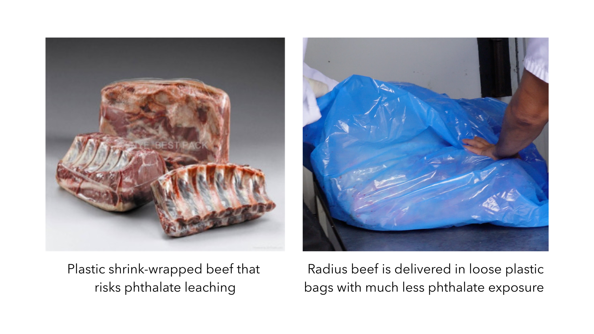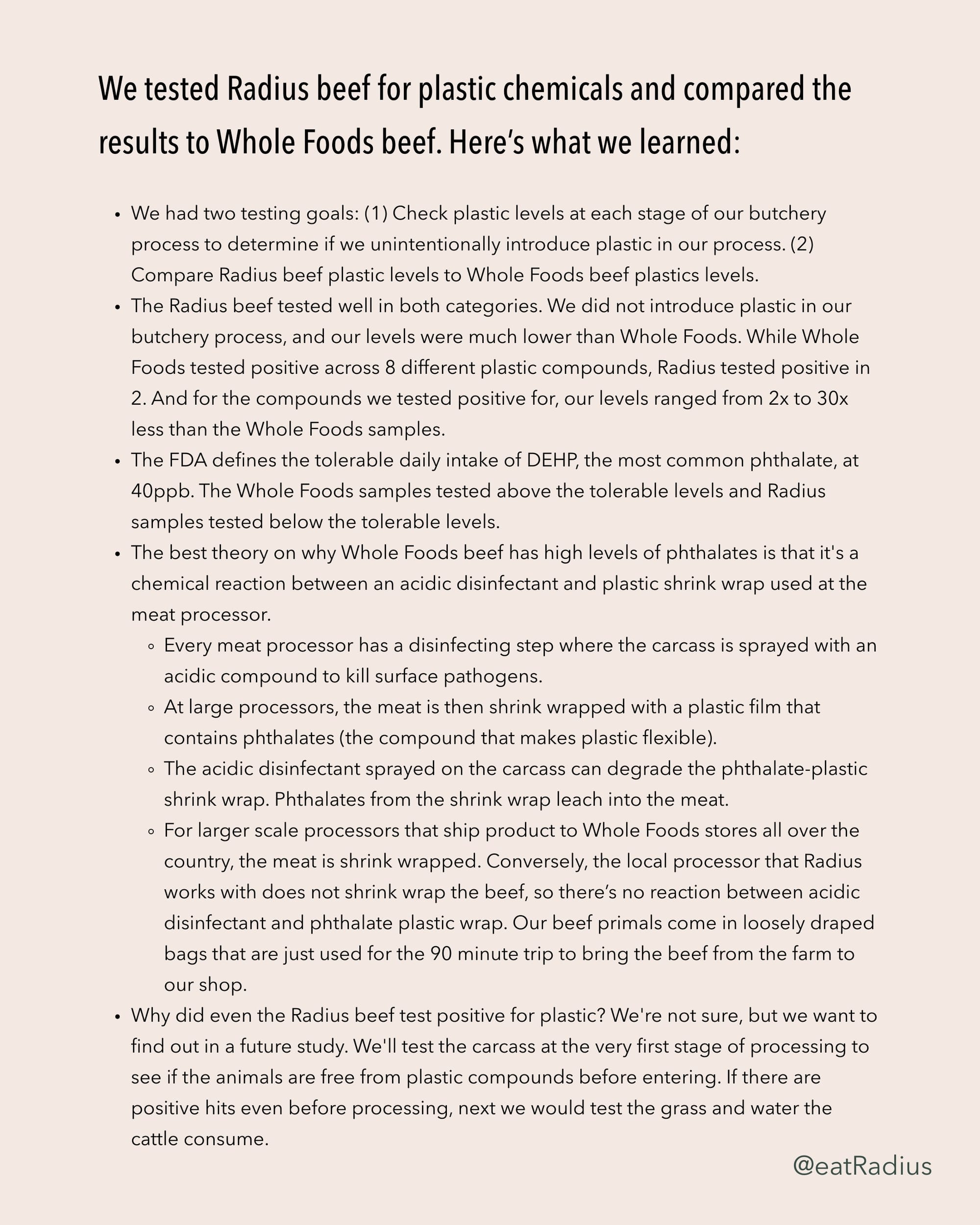 If Radius beef is never shrink wrapped, then why do even our samples test positive for low levels of phthalates? We're not sure, but we want to find out in a future study. We'll test the carcass at the very first stage of processing to see if the animals are free from plastic compounds before entering. If there are positive hits even before processing, next we would test the grass and water the cattle consume. This is all part of our effort to build the most nutrient dense, toxin free food system.