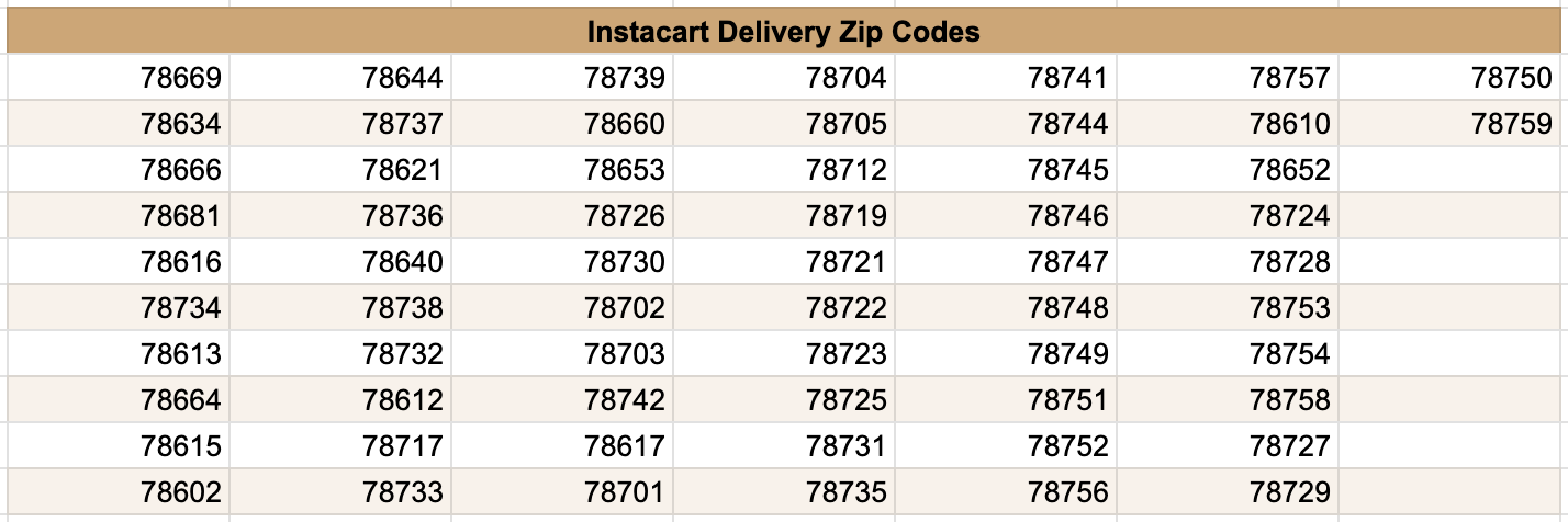 Instacart serves the greater Austin metro area from San Marcos (South) to Round Rock (North) to Spicewood (West) to Manor (East). Here are the specific zip codes that Instacart serves: